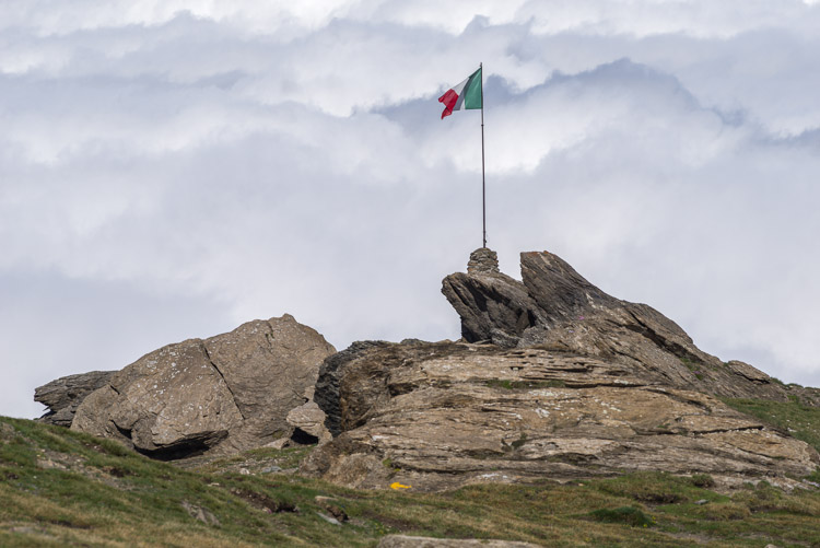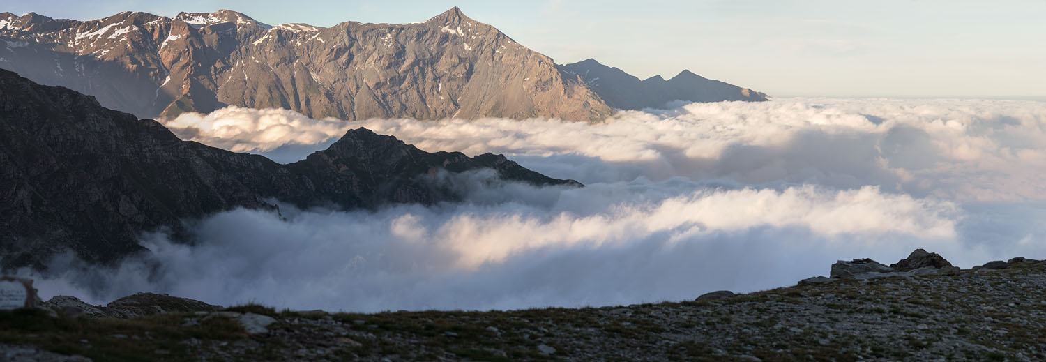 | A front of 3000 m peaks rising above the clouds seen from around Rifugio Vaccarone. | Rocciamelone with 3528 m dominates the skyline, with it's classic shape and exposed location. |
