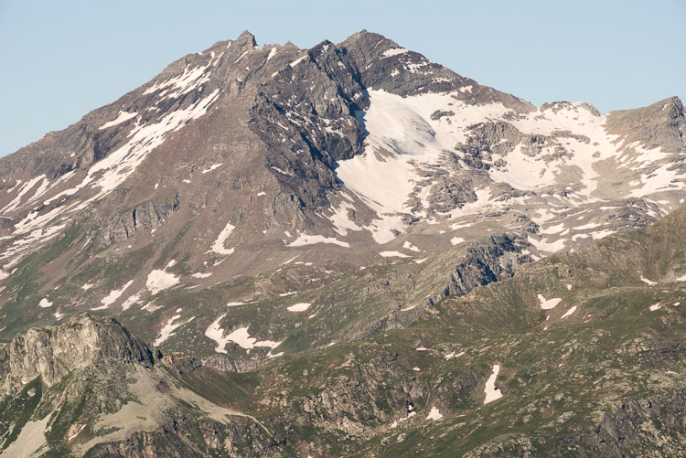 Rognosa d'Etiache, 3382 mA 3382 m high peak seen from a ruined hut on the Paso dei Fourneaux (3110 m). |